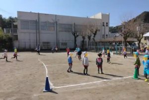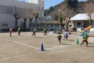給食の後は、広場で、元気にドッジボールやボールの蹴りあいをする姿がありました。