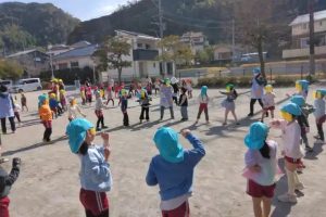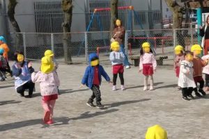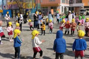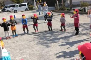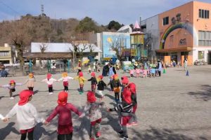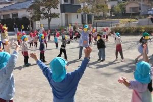 今日は、園児全員で広場に出て、なかよしリズムです。