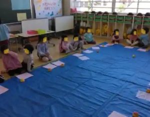 年中さんはが教室いっぱいにブルーシートを広げていました。