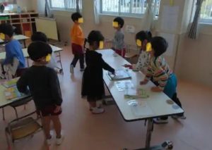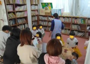 りす組のお友達のお友達も、自分で図書室の本棚から好きなら本を選んで、本を借りました。