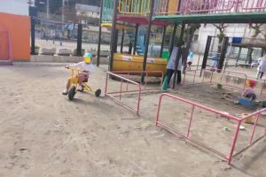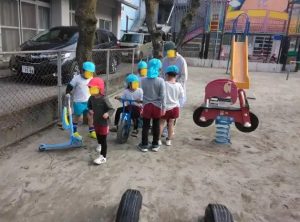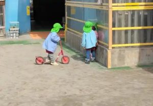 年長さんも三輪車乗り! 今のうち何回も乗りましょう! 小学校にはありません!