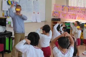 これまで習った英語、ヘッド、ショルダー等先生が指をさすと英語で答えていました。