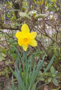 広場の道路側の花壇に咲く、水仙(すいせん)の花です。