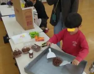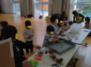 りす組のお友達、砂遊び・・・カップに砂を入れて、プリンやババロアのようなのを沢山作っています。