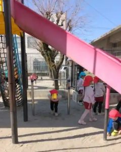 ・登園して、園庭では・・・御覧のとおり、早速大きな山も作られていました。