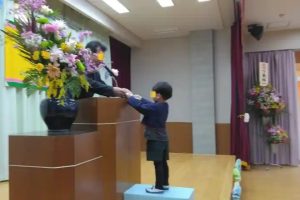 園児へプレゼントがあり、代表のお友達に受け取ってもらいました。