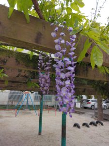 昨日の雨で、録がきれいです。藤棚には、藤の花が咲き始め、虫たちが集まり始めました。