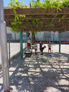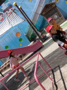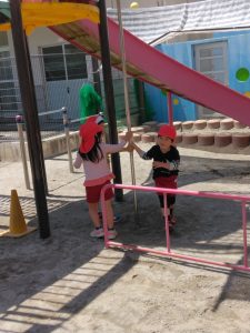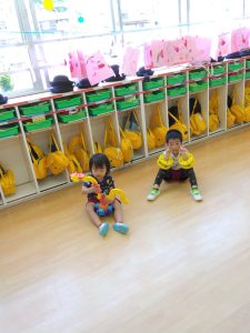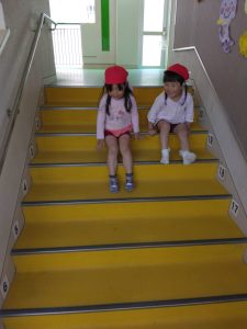 階段に二人で一緒にお尻をついて、一段ずつ降りるのを楽しんでいるお友達もいました。子供たちは、いろいろ楽しいことを考えますね!