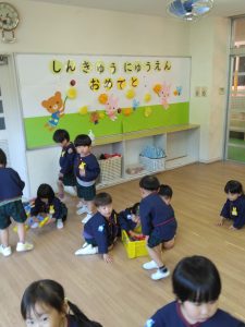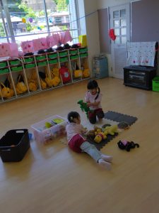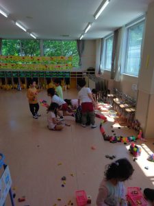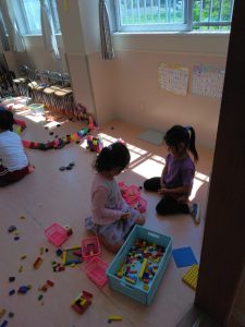 教室の中では、ブロック遊びをしたり、マットを敷いて、お人形で遊んでいる子もいます。