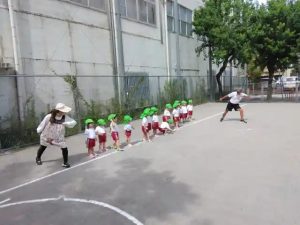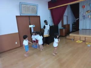 今日からは、通常の保育活動がスタートです。リス組さんは、下栗先生が来園した体育遊びの日です。