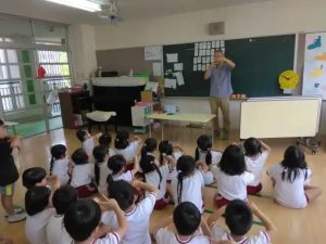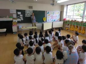 さくら組は、今日はトロイ先生の英語遊び。転入園児も早速一緒に、英語遊びの活動でした。A~Zまでのアルファベットを発音し、文字を手の形で表しながら
