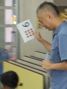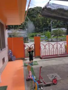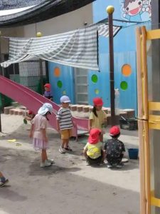 昼休み、外に出て、元気に遊ぶ子供たち。 暑いので、時々ミストの下に来て、涼しくなって・・・また、遊びに出ます。