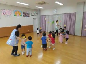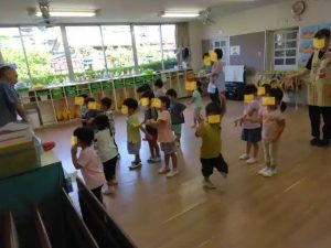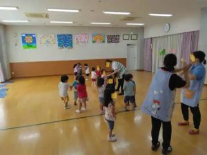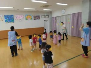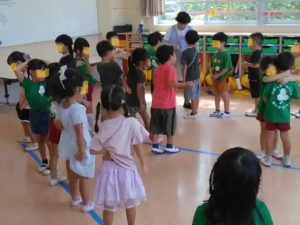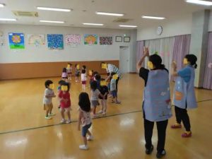 朝から外の日差しは強いです。りす組さんは、リズム室で、運動会に向けたダンスの練習をしました。