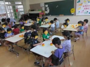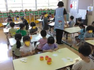 さくら組のお友達は、教室で折り紙工作をしていました。