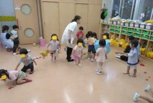 年長さんの体育遊び、リズム室で、組み体操の練習をしていました。