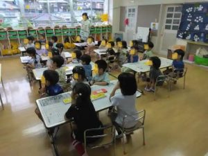 朝の会の様子です。名前を呼ばれたら、ハイ!と返事をして手を上げます。