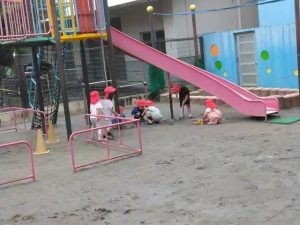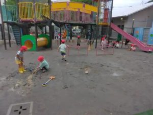 子供たちは、園庭の水たまりで泥んこ遊びなどをして遊んでいました。