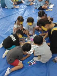 年長さんは、看板に貼る、文字に色つけを担当しました。