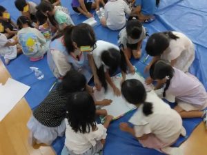 上の3枚は、みんなで色を、大画用紙に移すために、上から力を加えているところです。