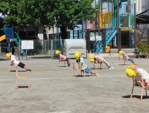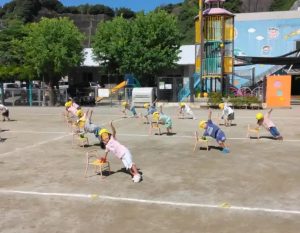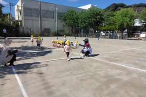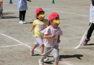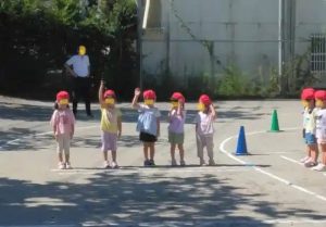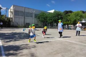 年長さんかけっこ、手の上げ方から、元気いっぱいです。