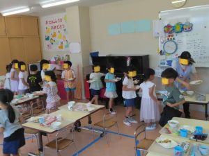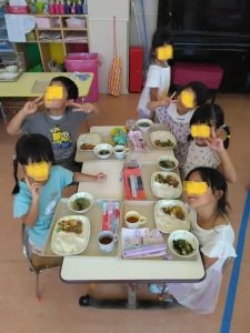 すみれ組の給食の様子です。練習などで体力を使うから、お変わりの列!