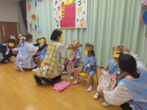 年少々・りす組は、誕生月の子は一人。とても緊張すると思うのですが、一人ででも先生との受け答えもちゃんとできていました。どの子も、これまでのお友達のする様子などを見ながら、「自分のものにしているのだなぁ」と思うことでした。