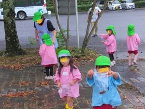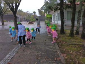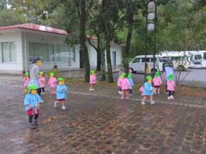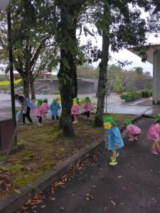 りす組さんは、今日はどんぐり拾いの日。園を出る時は雨もなく・・・