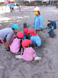5人ほどで、棒倒し遊びをしています。 見ていたお友達が、★「僕も仲間にいれて!」と言って、その次は一緒に仲間に入って、みんなで楽しく遊んでいました。