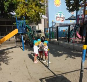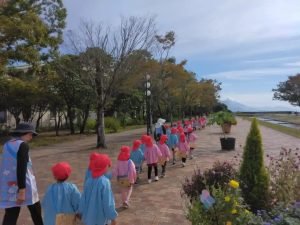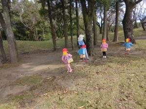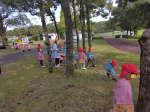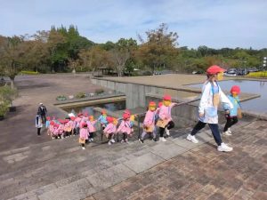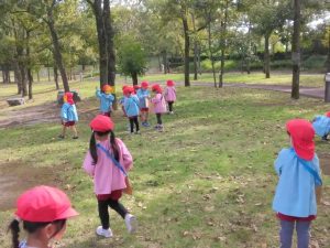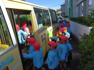 年中さんは、今日は、健康の森公園で「どんぐり拾い」の日。バスに乗るときには、運転手さんに「おはようございます。!」と元気いっぱいの挨拶をして乗車していました。
