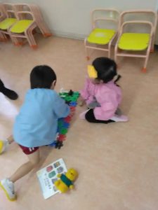 朝のりす組さんの教室、二人でタイルを敷き詰めてあそんだり、お友達と一緒にブロック遊びをする姿もありました。