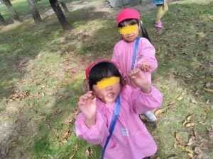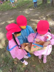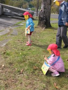 お友達と、どんぐりを見せ合う姿も。 子供が首からかけている青いひもの付いたバッグは、一人一人お絵かきして作った自家製のバックなのですよ!