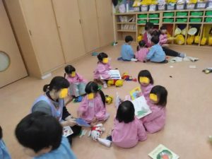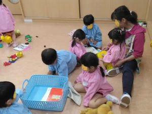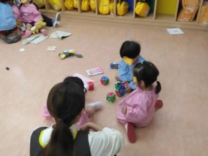 今日は朝から雨、りす組の登園後の子供たちです!保育士の先生と一緒に本を読んだり、ブロック遊びをしたり・・・