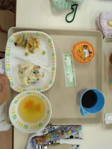 今日の給食では、カボチャのサラダ、パンプキンババロアなどハロウィーンにちなんだメニューでした。